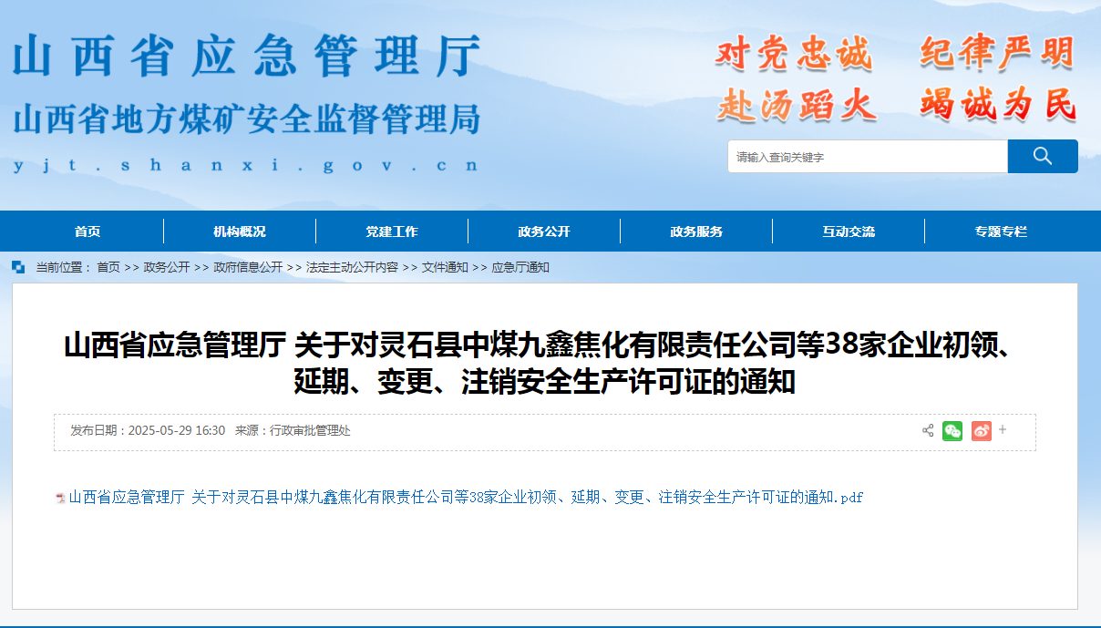 山西省應(yīng)急管理廳 關(guān)于對靈石縣中煤九鑫焦化有限責(zé)任公司等38家企業(yè)初領(lǐng)、延期、變更、注銷安全生產(chǎn)許可證的通知
